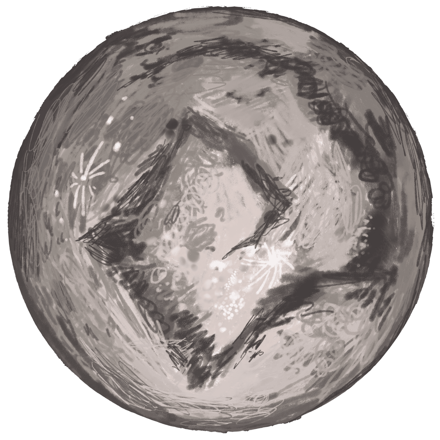 Queen, their moon, whose "scar" is a curious spiral of yet unexplained origin, has been there since the most archaic days of what they call home. The moon seems to be everywhere; from any kind of ancient representation scribbled with a pen, to illustrations of folk tales that do not even try to mention it, to current political campaigns, fashion, designs... And it also seems to be something that only non-humans fully understand; a sign that only appears in those who are not human. Why do they love their spiral so much...?